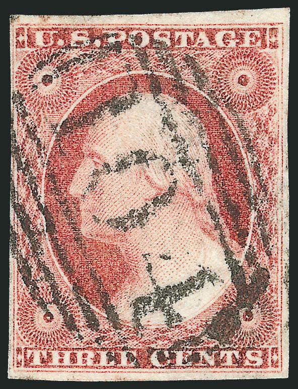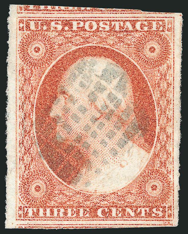 473   Image3c Claret, Ty. I (11). Large to huge margins including portions of adjoining stamps at top and bottom, pretty bright shade, unusual dotted grid cancel, Extremely Fine Gem, a gorgeous stamp (Image)