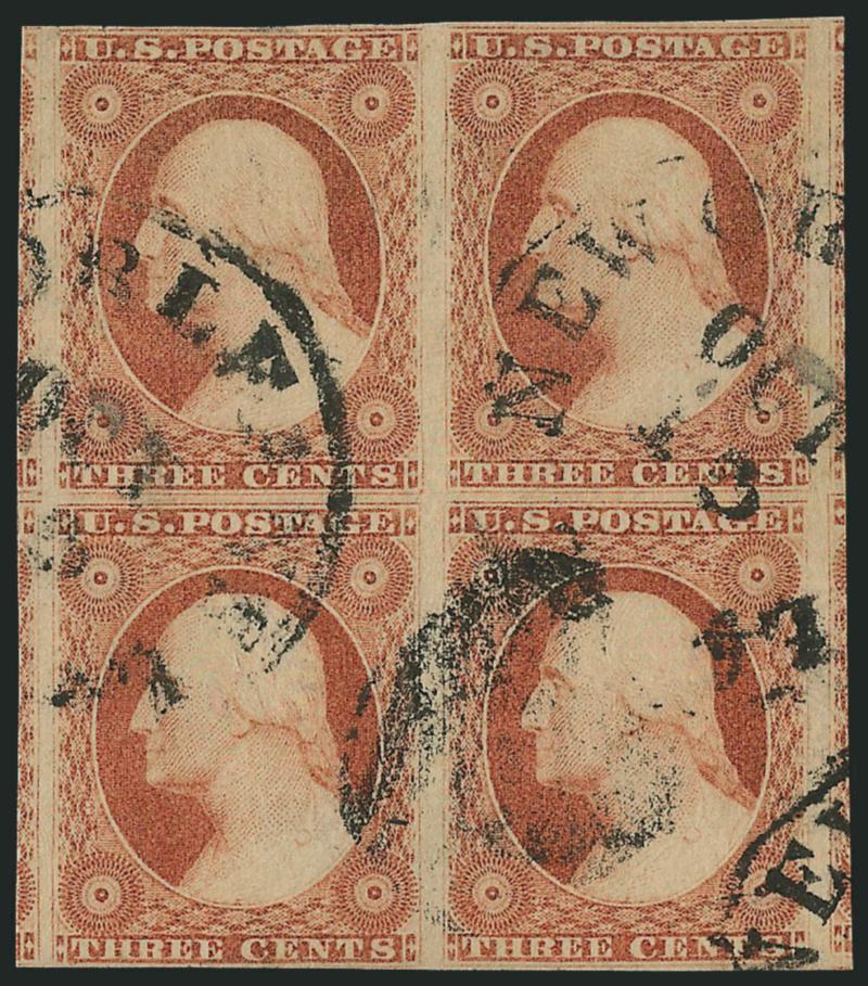 471   Image3c Claret, Ty. I (11). Huge margins all around including portions or traces of six adjoining stamps, a seventh would certainly be present but the entry to the right is significantly out of registration and is much higher, bright color, town cancel, Extremely Fine Gem, a superb stamp (Image)