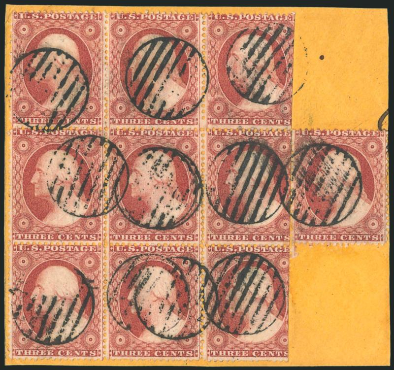 510 bl Image3c Dull Red, Ty. III (26). Block of nine and single, block scissors-separated at right slightly in, rich color, tied by circular grid cancels to yellow piece, Fine and scarce large used multiple, Scott Retail as block of four, strip of three and pair does not adequately convey the scarcity of this piece (Image)