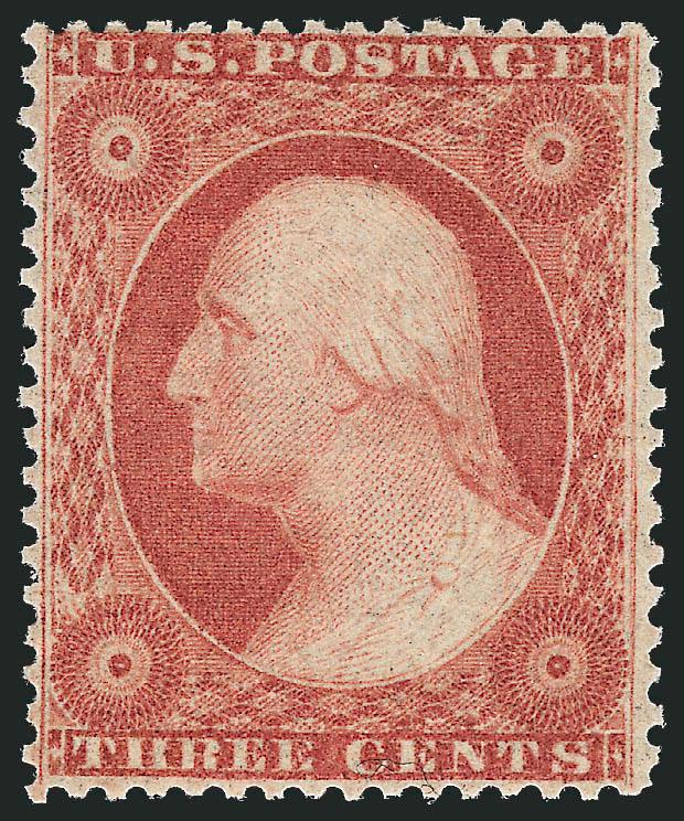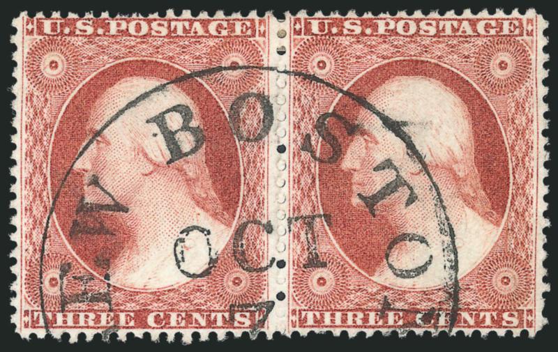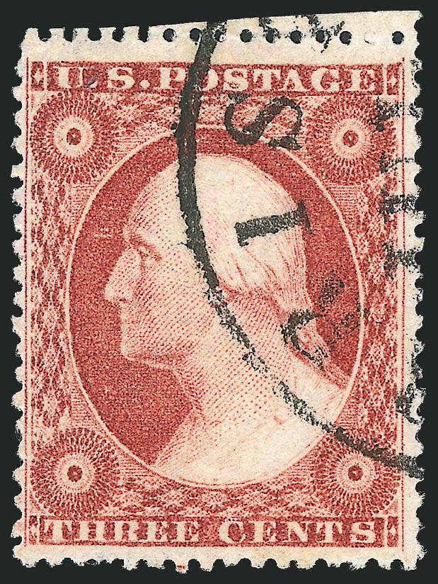 The 3c 1857 Type IV stamps printed from Plates 10 and 11 are notorious for poor centering and tight margins, especially at top and bottom. This extraordinary exception to the rule is the finest example we have encountered. (Image)