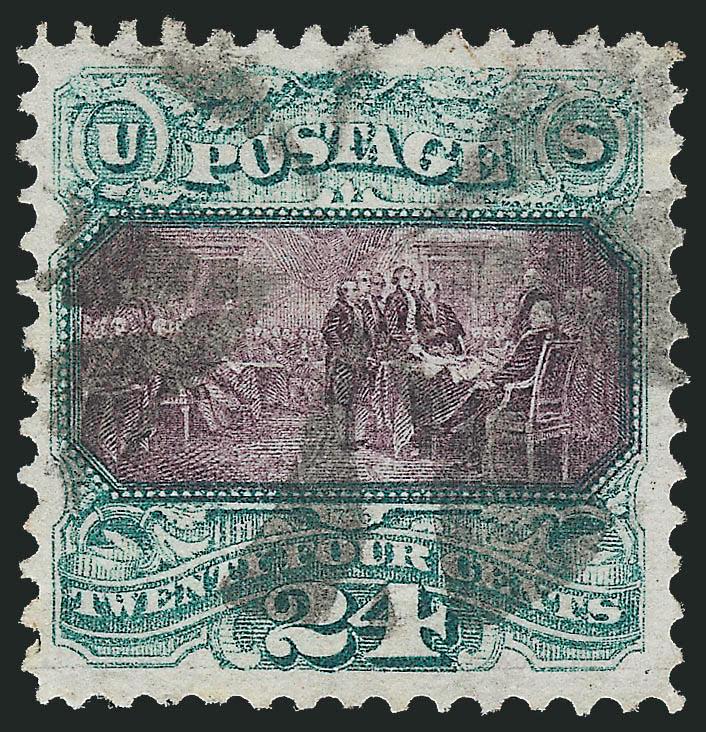 24c Green & Violet (120). Cork cancel leaves central vignette clearly visible, wide to full margins, fresh and Very Fine, with 2000 P.F. certificate (Image)Search for comparables at SiegelAuctions.com |
