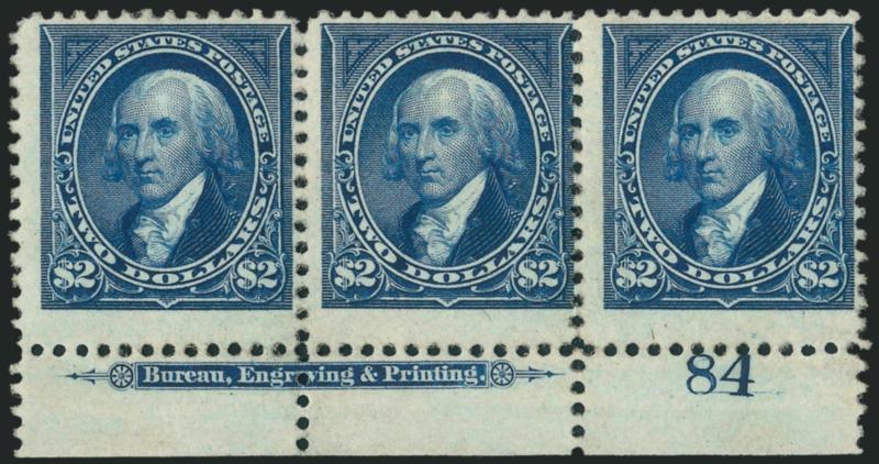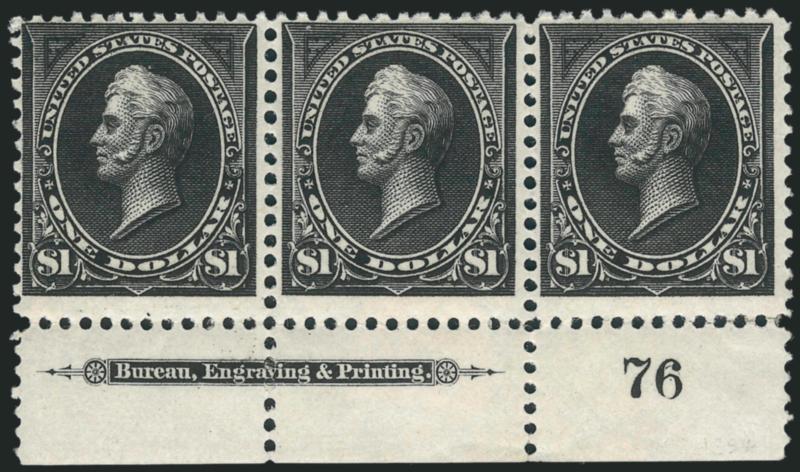 FINE-VERY FINE. A RARE COMBINATION IMPRINT AND PLATE NUMBER STRIP OF THREE OF THE 1894 UNWATERMARKED $1.00 ISSUE, COMPRISING TWO TYPE II STAMPS AT RIGHT AND ONE TYPE I STAMP AT LEFT.
