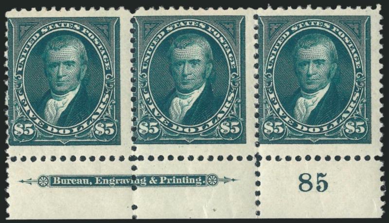 FINE. AN EXCEEDINGLY RARE IMPRINT AND PLATE NUMBER STRIP OF THREE OF THE $5.00 UNWATERMARKED BUREAU ISSUE, WITH TWO STAMPS IN MINT NEVER-HINGED CONDITION. THIS ISSUE IS NOT KNOWN AS A FULL PLATE BLOCK -- AN IMPRINT AND PLATE NUMBER STRIP IS THE ONLY MULTIPLE TO COME CLOSE (ASIDE FROM A BLOCK OF FOUR WITH IMPRINT ONLY).