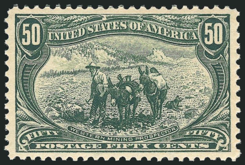 The 50c Trans-Mississippi is extremely scarce in well-centered condition. It also seems that fewer 50c stamps exist in Mint N.H. condition, relative to the dollar values of the set. The combination of Extremely Fine centering and Mint N.H. condition is exponentially rarer.