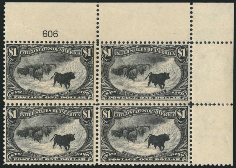 FINE-VERY FINE APPEARANCE. AN ATTRACTIVE CORNER SHEET SELVAGE BLOCK OF FOUR OF THE $1.00 TRANS-MISSISSIPPI ISSUE WITH PLATE NUMBER.