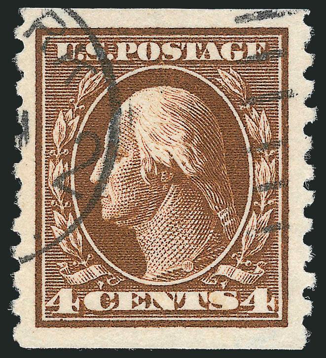 Type I rotary press stamps were produced using the same master dies as had been used for flat plate printings. However, due to the curve of the plate to fit the rotary press, the impressions lacked some of the details of the flat plate printings. New dies were made with strengthened lines, resulting in the Type II stamps. After plate wear was noticed, further strengthening was necessary, resulting in the Type III stamps. Scott 449 was not produced until almost a year and a half after the Type I horizontal coil, Scott 453. Due to the unpopularity of vertical coils, this Type I stamp was in production for only a short period of time before being discontinued.